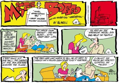 I am just getting around to reading yesterday’s newspaper, and Mr. Boffo is boffo this week. As I am writing a mystery and my writing group are all doing the same, we have been discussions related to reader expectations. This cartoonist captures some of the more common identifiers of the noir subgenre… as applied to an appliance manual. Rich.