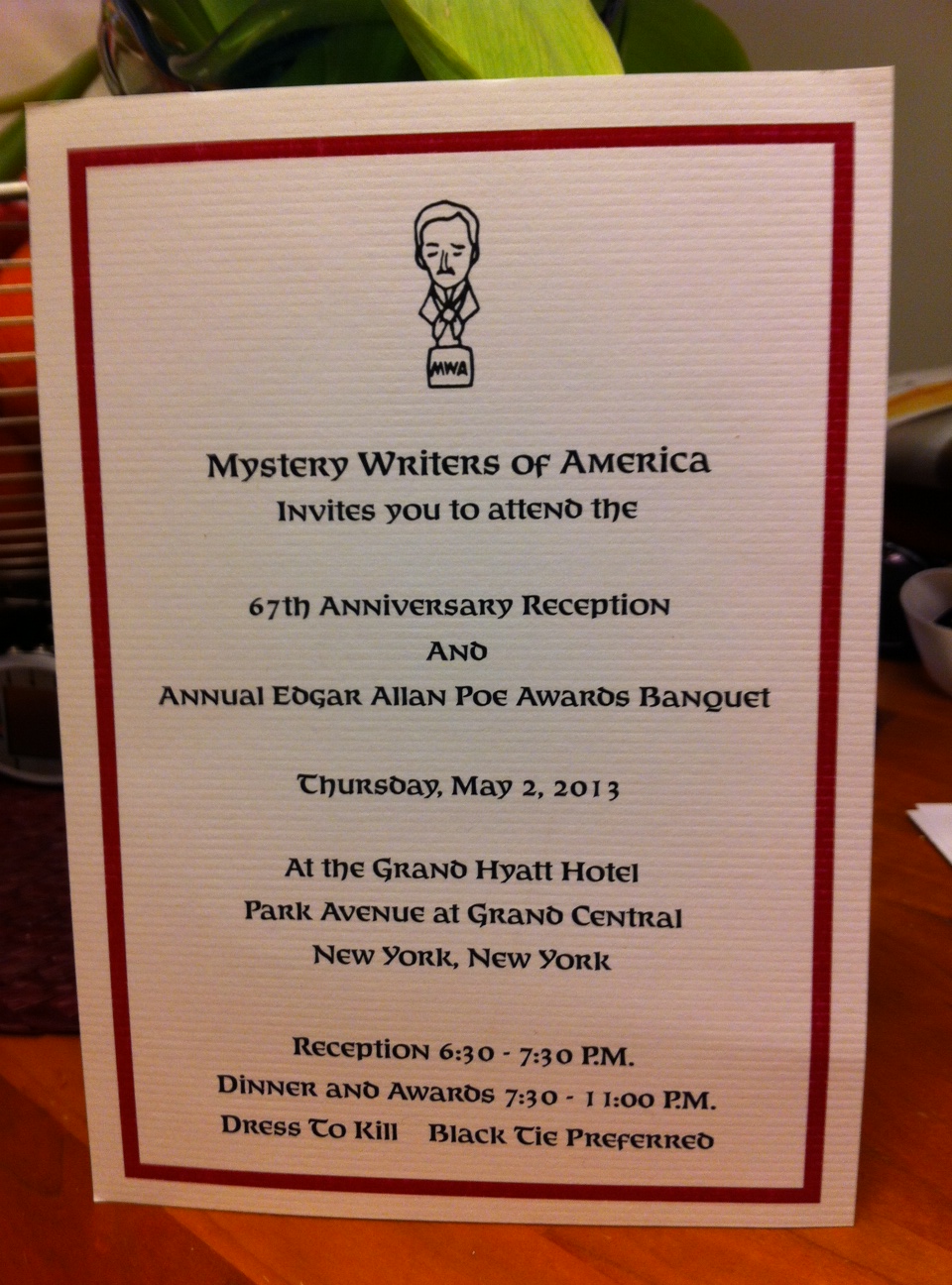 My invite to the Mystery Writers of America Banquet and Awards Ceremony, plus all the details about the Edgar Symposium, came in the mail today. I am an MWA member (albeit not an active member, I have not yet met the requirements).